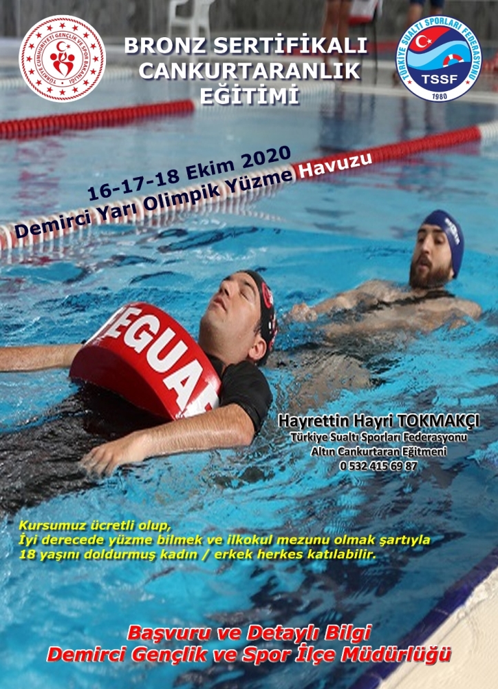 Can kurtaranlık, hayat kurtarmanın yanında kendinize yeni bir meslek edinebilmeniz için harika bir fırsat! 16-18 Ekim 2020 tarihlerinde Demirci Yarı Olimpik Yüzme Havuzunda, Türkiye Sualtı Sporları Federasyonu tarafından yetkilendirilmiş Altın Cankurtaran Eğitmeni Hayrettin Hayri TOKMAKÇI önderliğinde Bronz Sertifikalı Can Kurtaranlık Eğitimi verilecektir.